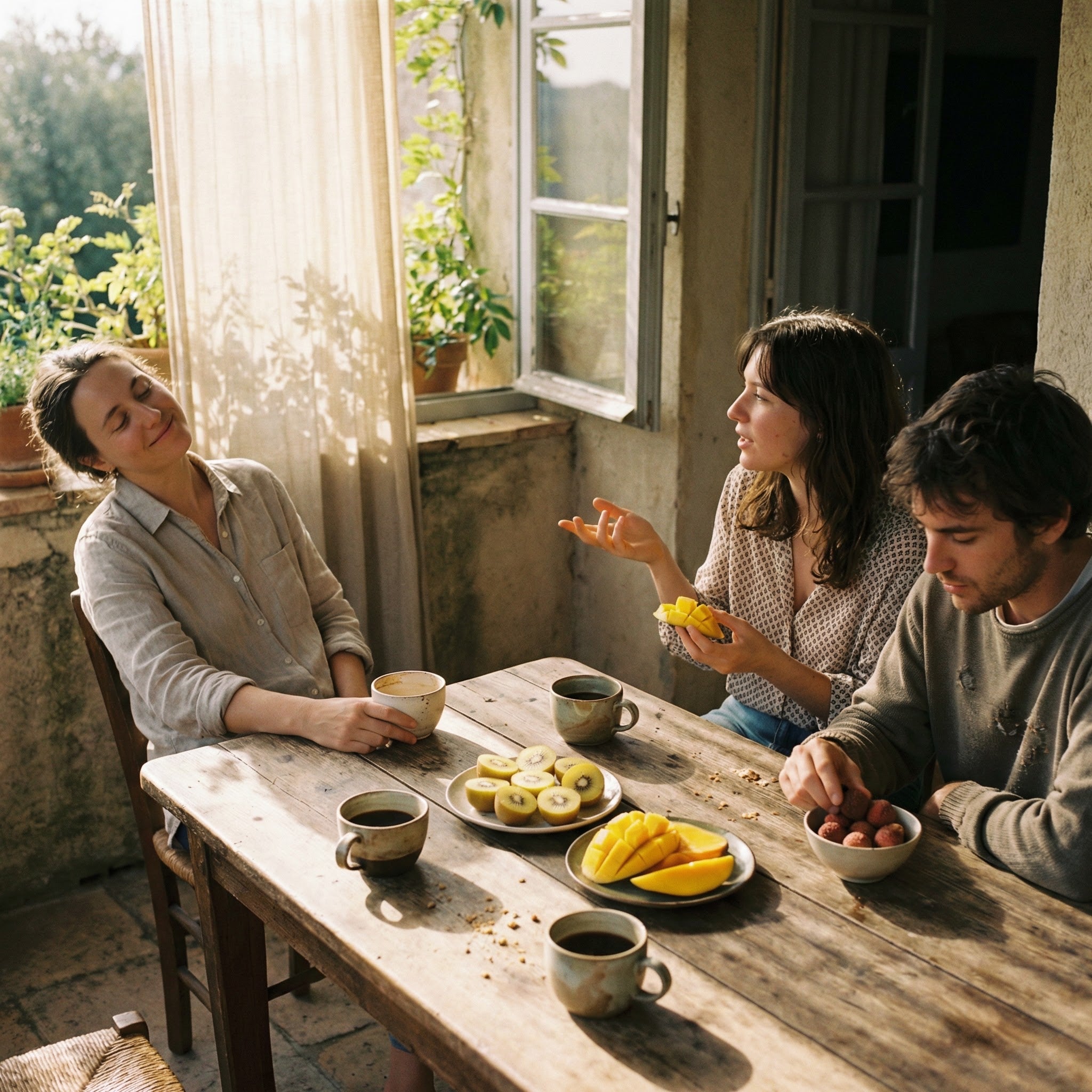 The moment starts bright and easy. Sunlight fills the room, fruit on the table feels fresh and inviting, and conversation flows without effort. The first sips feel lively and clear, setting a light, energetic tone.