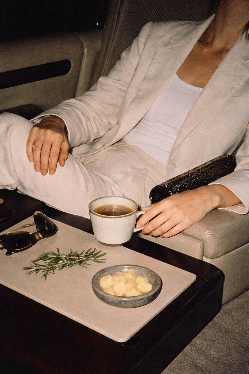 On the way to an evening gathering, he sits alone in the back seat, dressed in a soft linen suit. The fabric is light, breathable echoing the coffee’s green-tea clarity and floral lift.