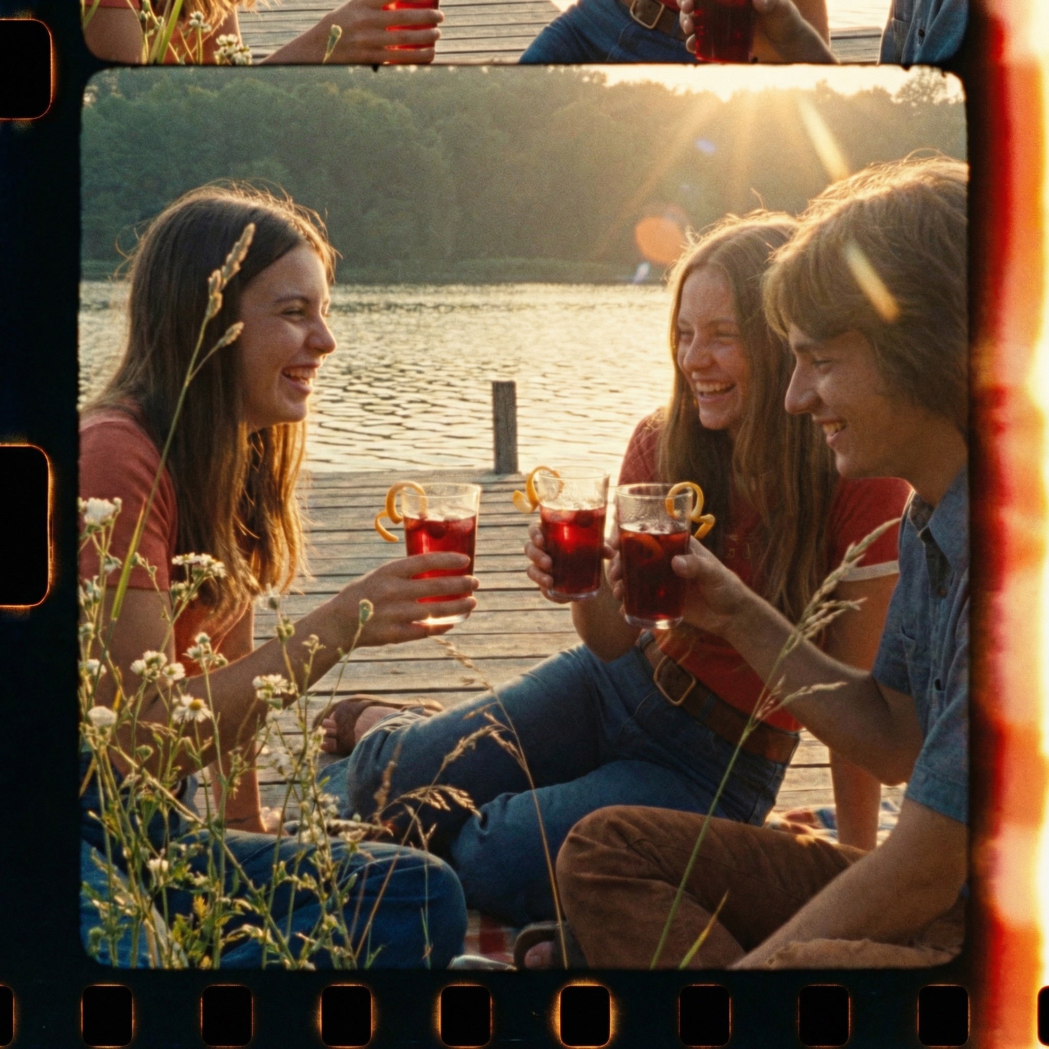 Sun on the water, wildflowers in bloom, and a glass of bright cherry juice with a twist of orange peel.